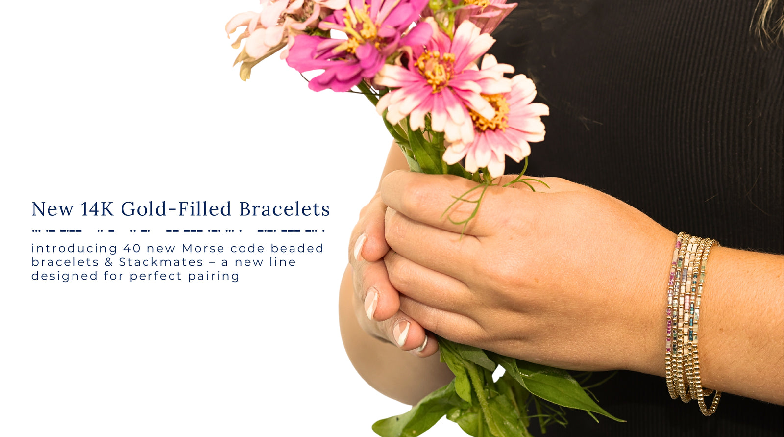 Introducing "Stackmates" -- over 30 new 14K gold-filled bracelet designs that go perfectly with our Morse code bracelets and everything else you wear. Add a little sparkle and color to your stack!