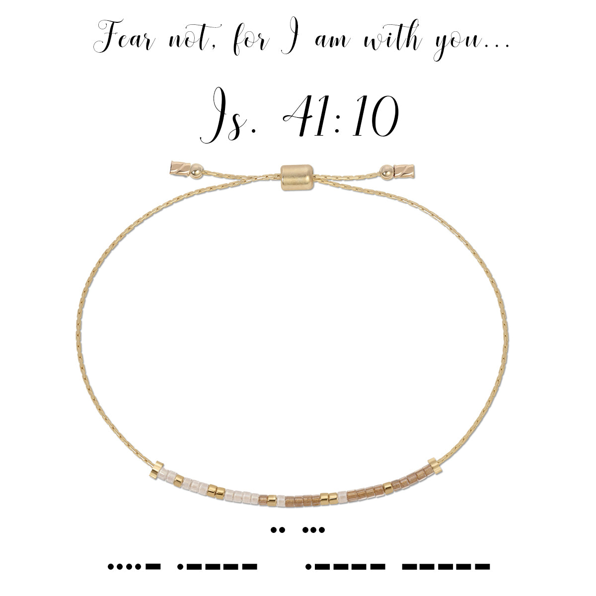 Encourage your best girl to claim the Isaiah 41:10 strength and courage that is already within her. The glass beads of this Morse code design are a beautiful shimmery white and light champagne that will pair well with any outfit.