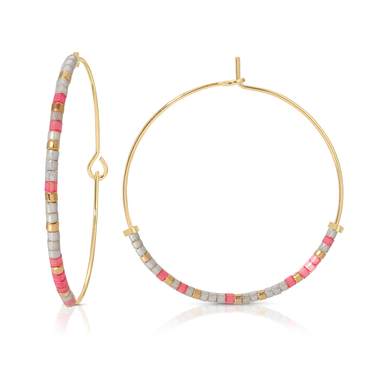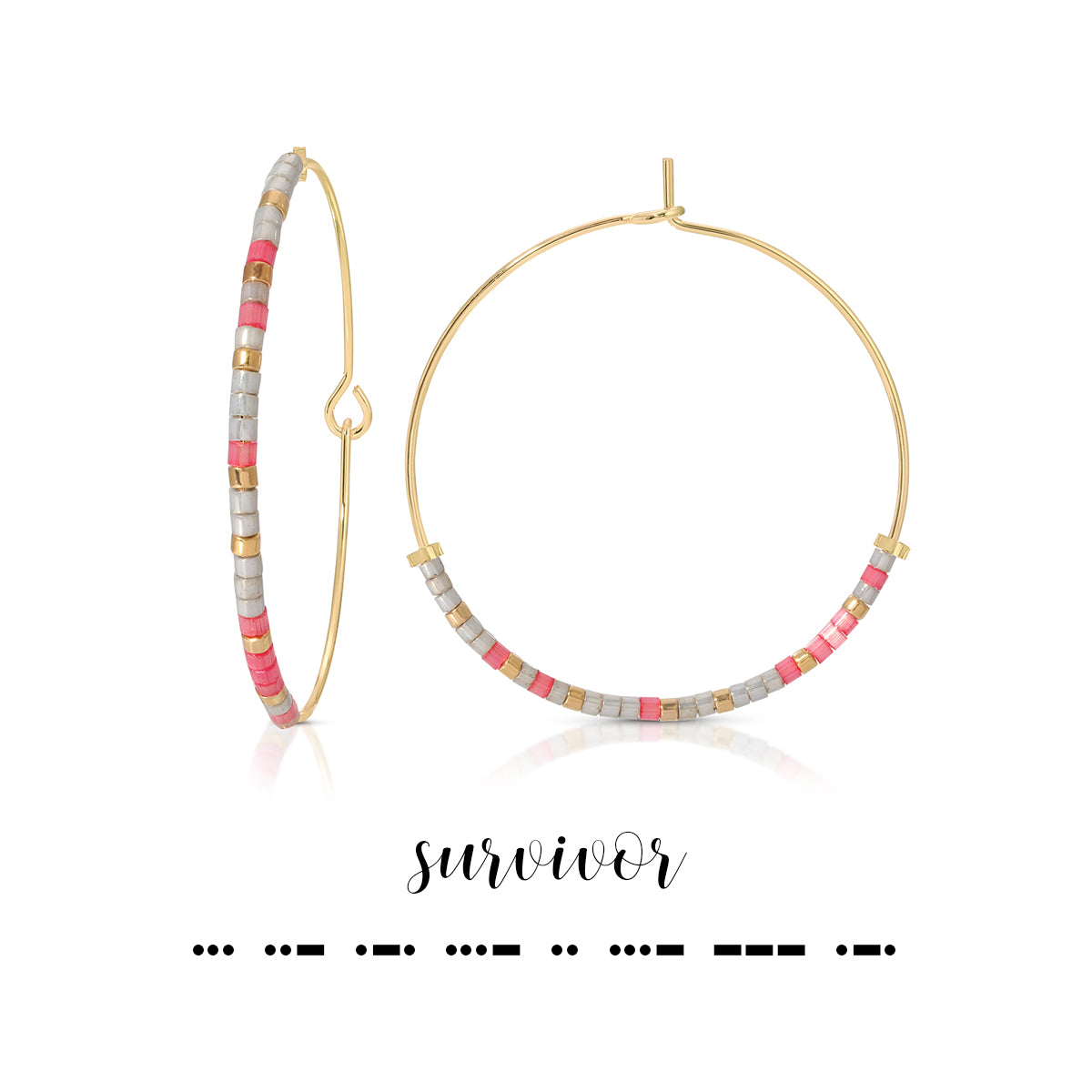 Survivor is an encouraging Morse code earring design that reminds her she is full of grit, persistence and triumph. This uplifting message is encoded using pink and pewter glass beads.