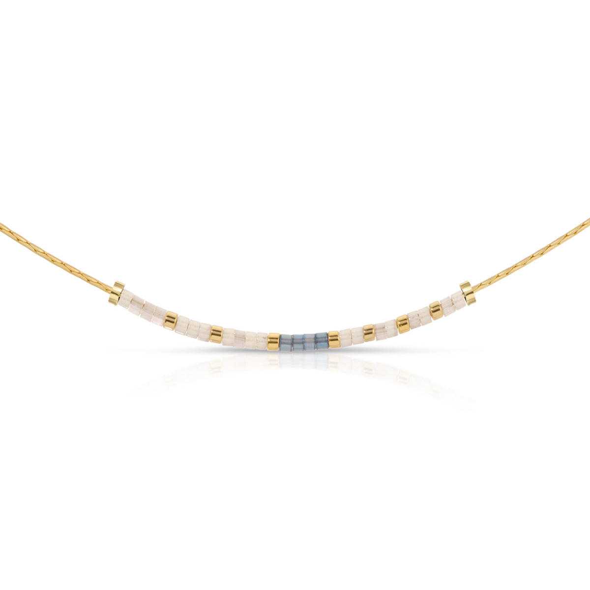 This beautiful necklace celebrates moms raising boys with a design that encodes the words 'Boy Mama' into a Morse code design with neutral colors and a hint of blue.
