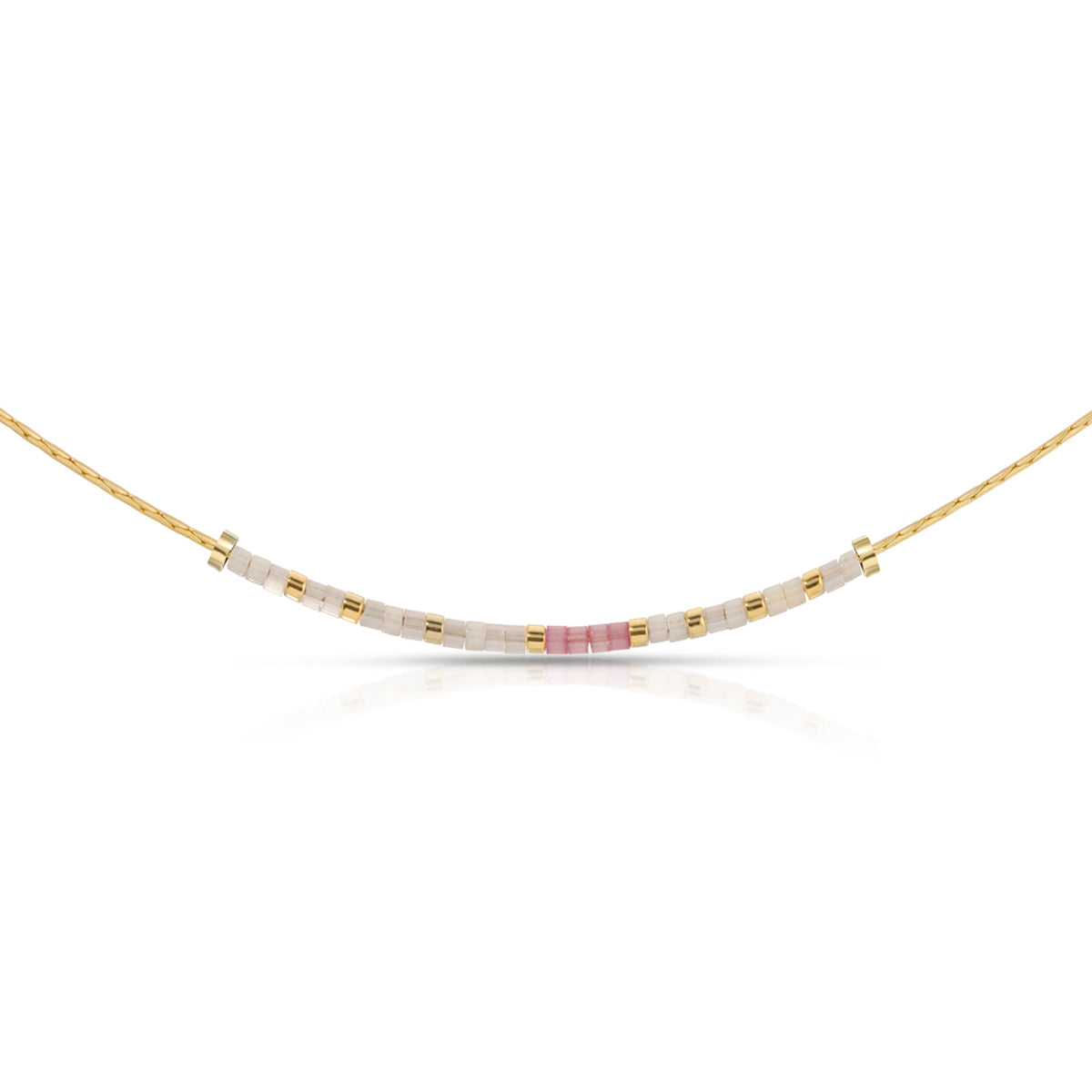 This beautiful necklace celebrates moms raising girls with a design that encodes the words 'Girl Mama' into a Morse code design with neutral colors and a hint of pink.