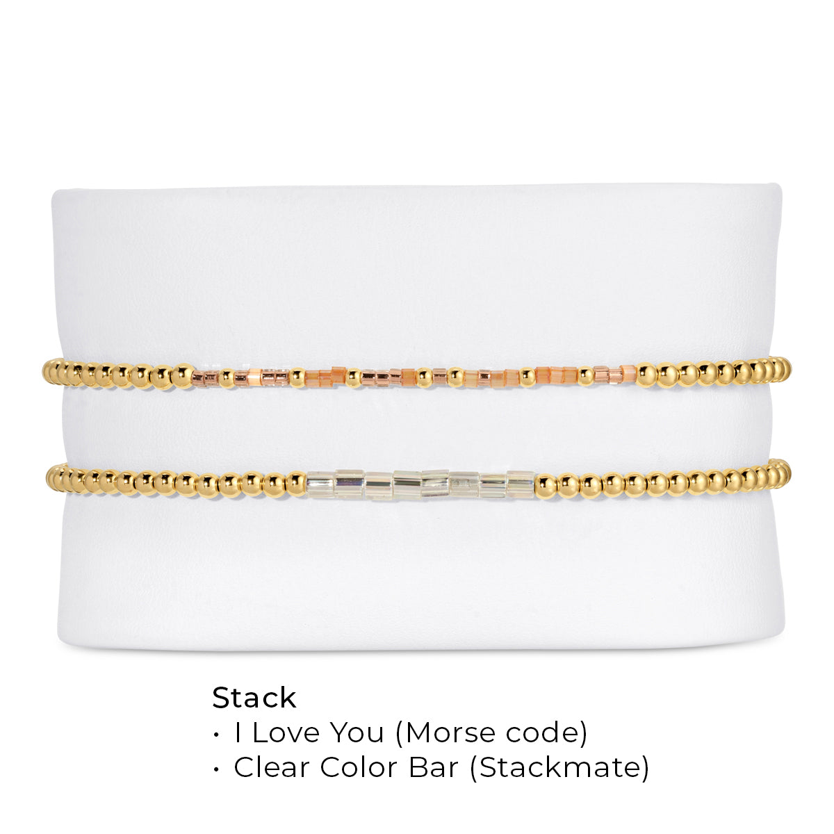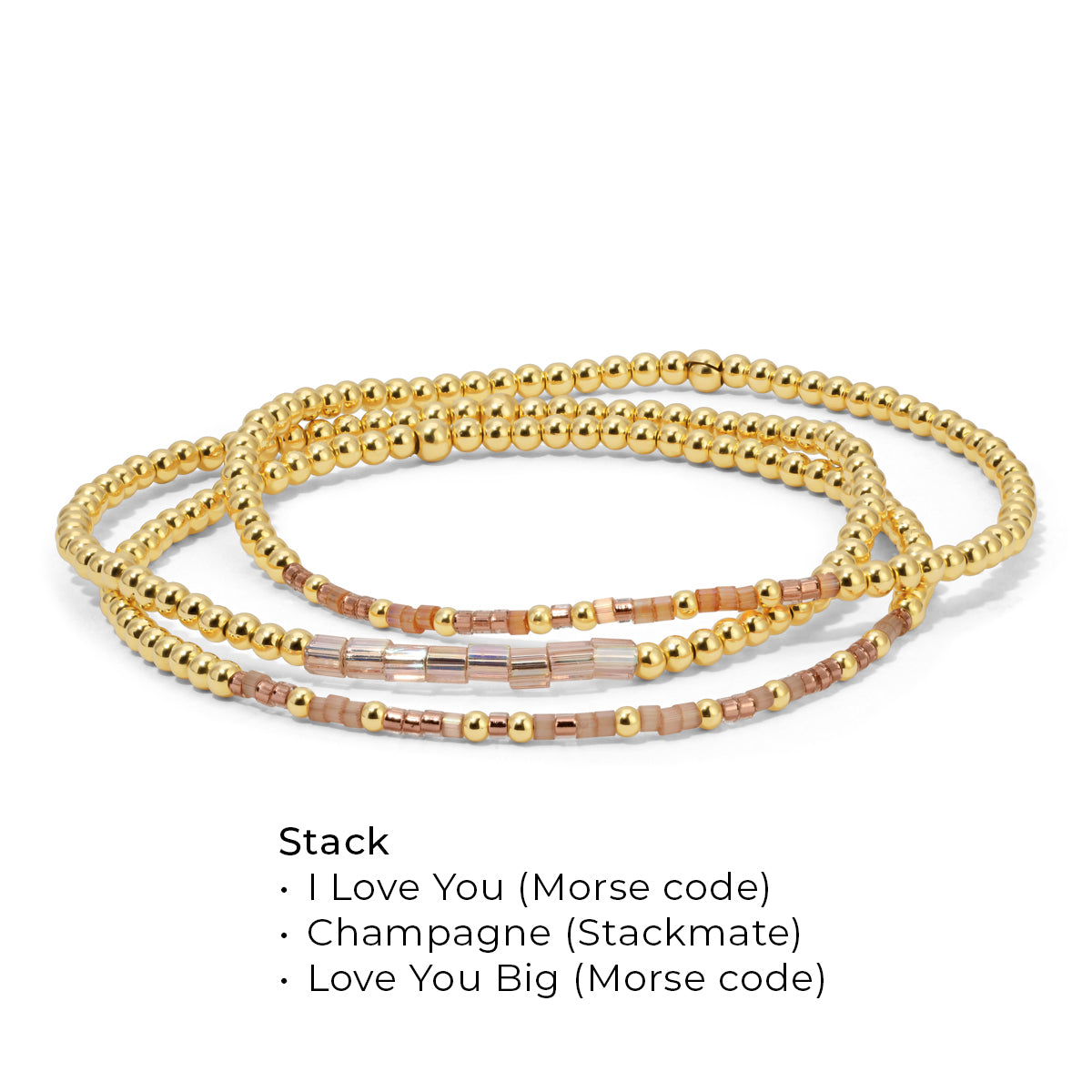 Our I Love You design is a top seller and a favorite gift that fits so many occasions. This very popular Morse code message is encoded using beautiful blush and peach champagne glass beads in a subtle design that works perfectly with many different outfits.